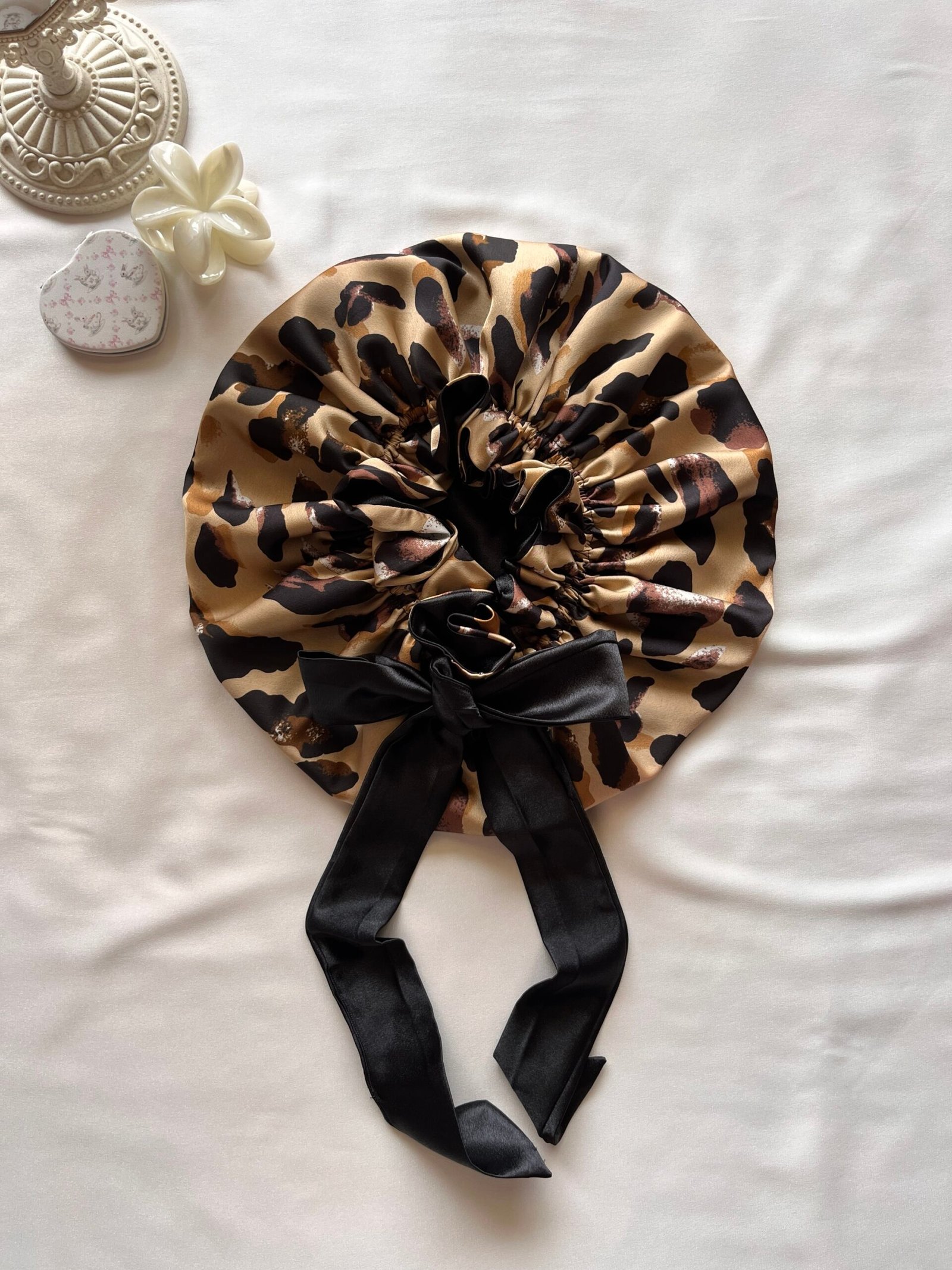 قبعة “ميدنايت ميوز” هي قبعة ساتان أنيقة بلون أسود داكن ونقشة جلد النمر الناعمة.