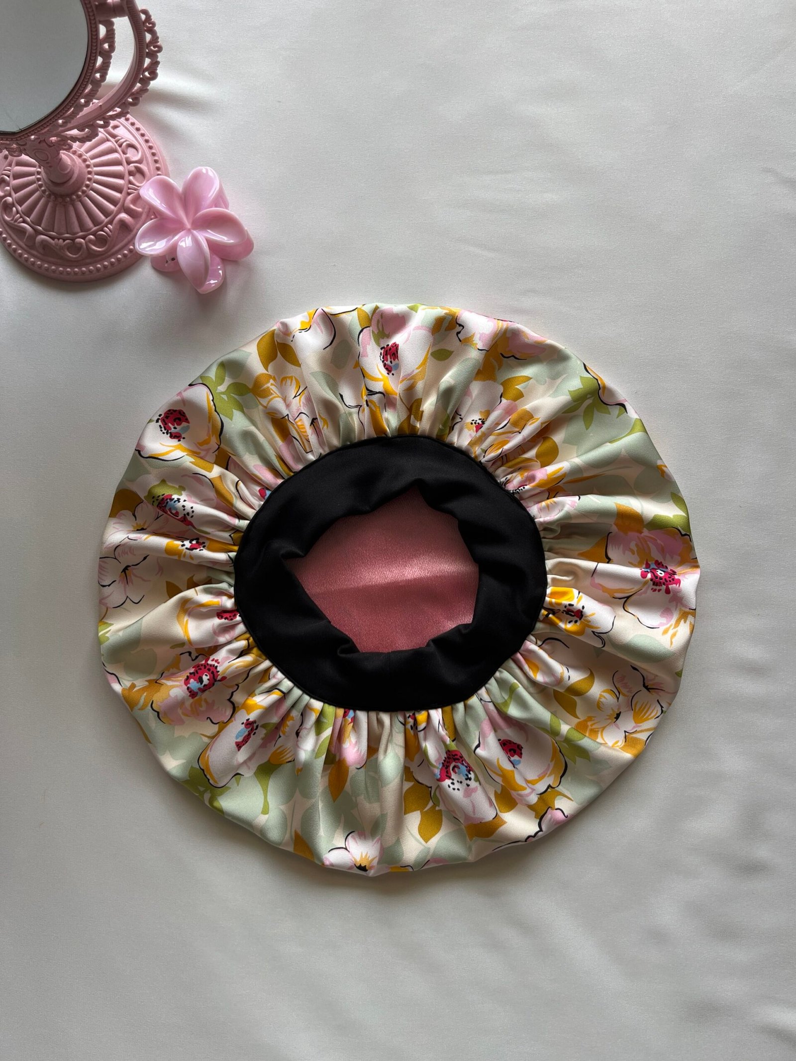 Honey Bloom is a fully reversible bonnet featuring a warm cream floral print limed with a blush satin fabric.