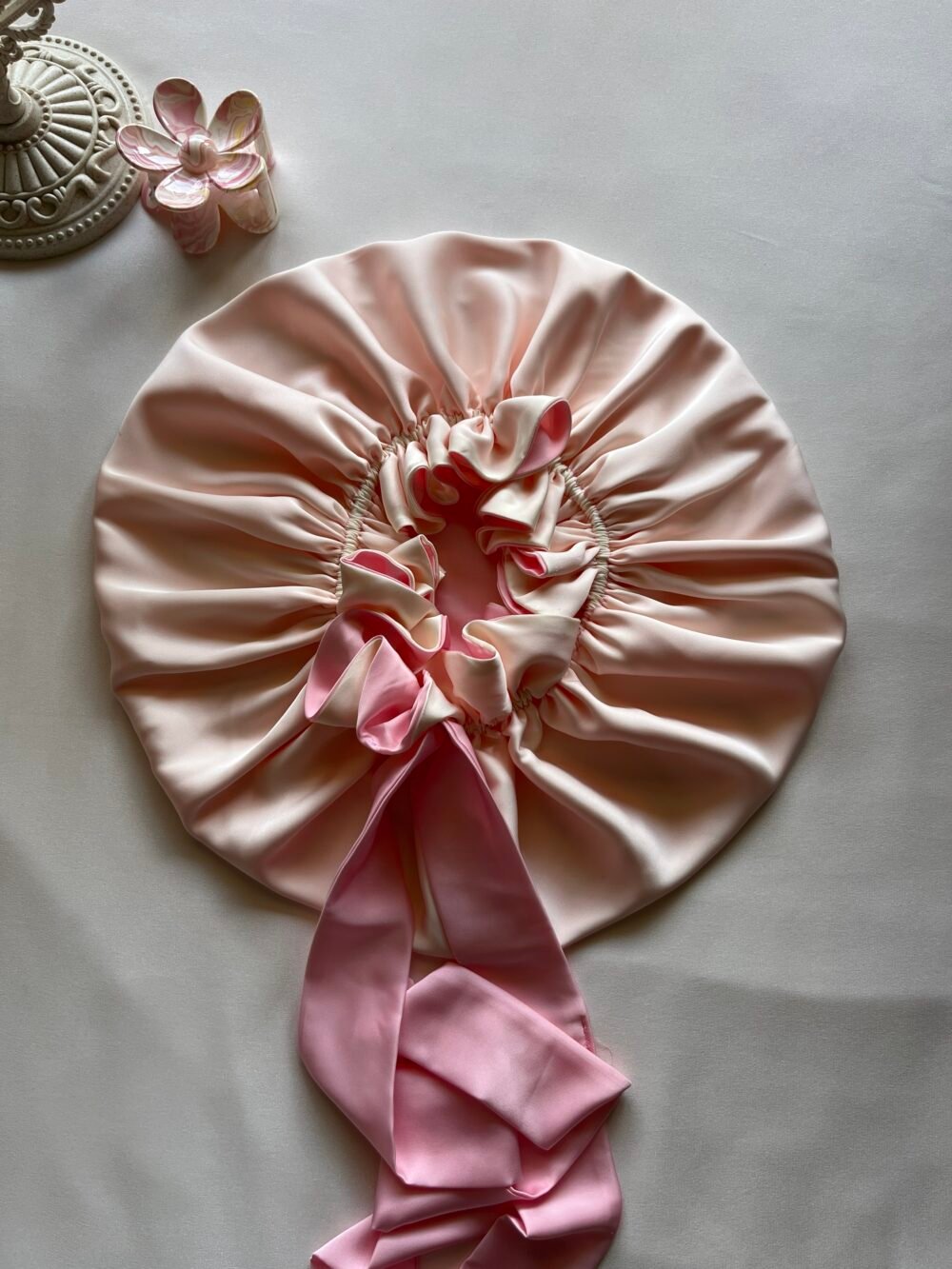 The Pale Bloom Satin Hair Bonnet is designed to protect your hair while keeping your night routine soft and beautiful.