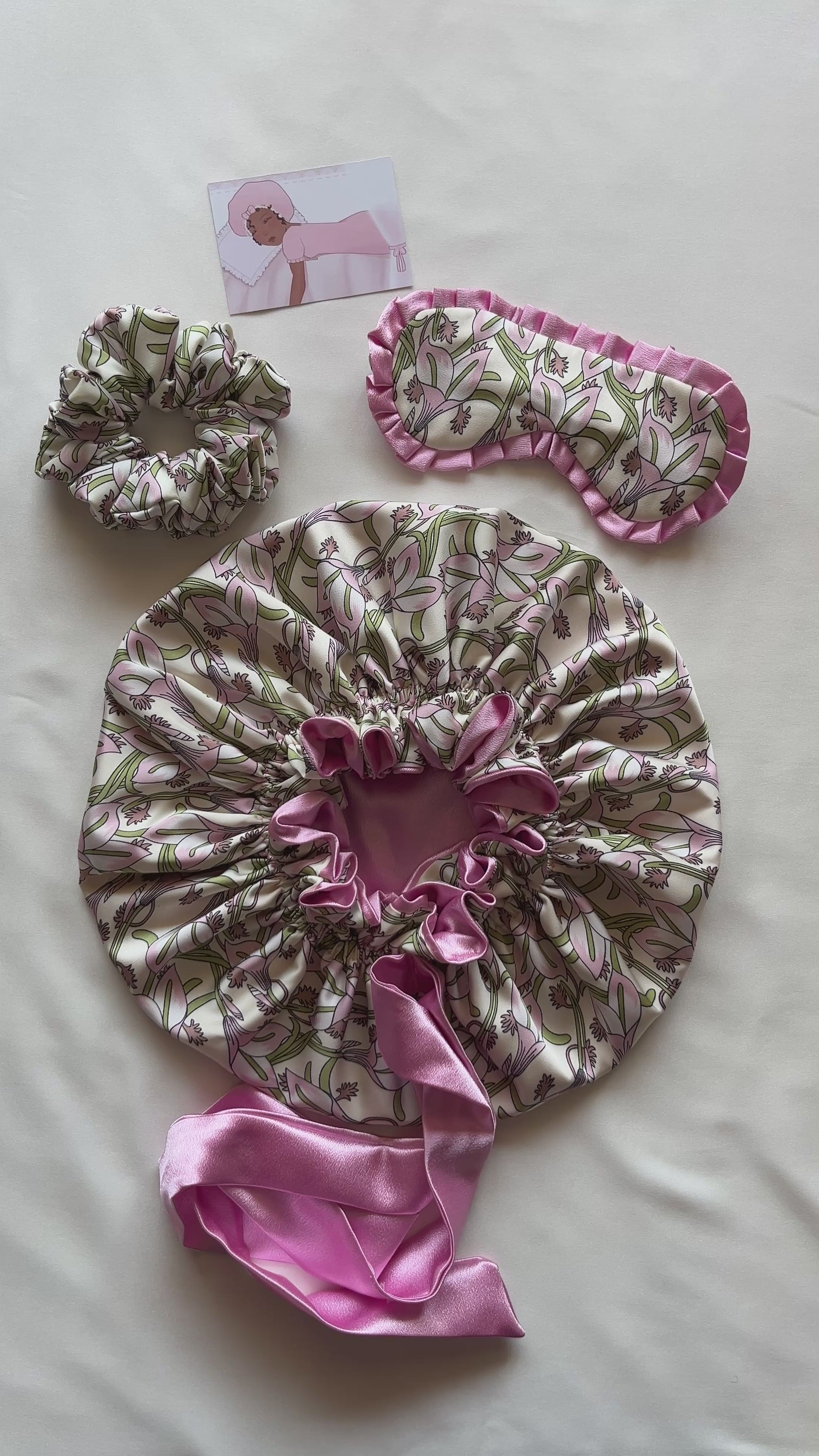 A dreamy trio for your hair, skin, and soul. The Aurora Petal Sleep Set includes our matching bonnet, sleep mask, and scrunchie, each crafted from our luxe satin fabric in a delicate floral design. Together, they help prevent breakage, retain moisture, and give you the beauty rest you deserve. Perfect for gifting or travel.