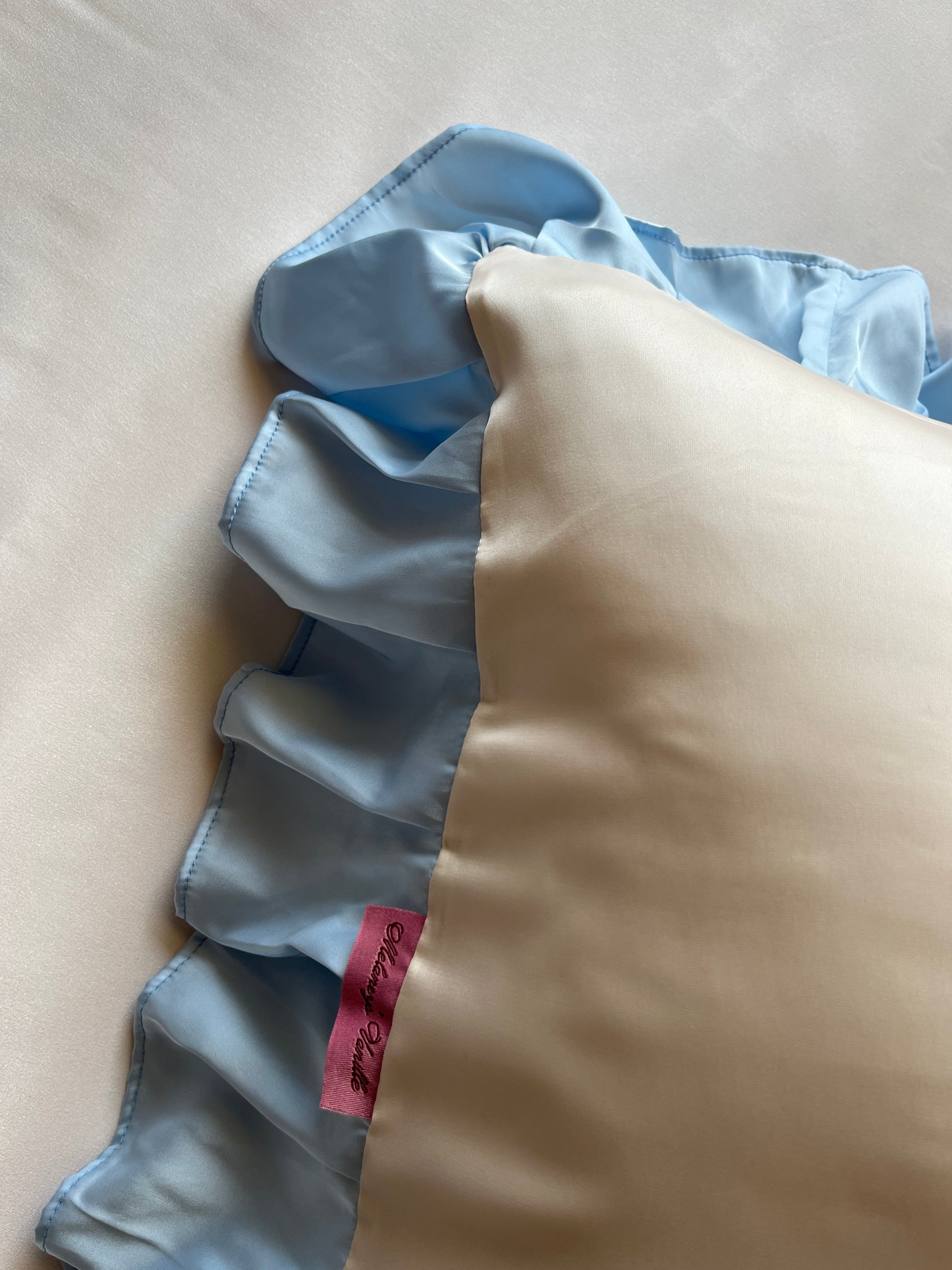 Drift into your sweetest dreams with our silk blend pillowcase in blue and cream, crafted to feel like a love letter against your skin. Smooth, breathable and gentle. It helps keep your hair tangle free and your skin glowing while you sleep 💗
