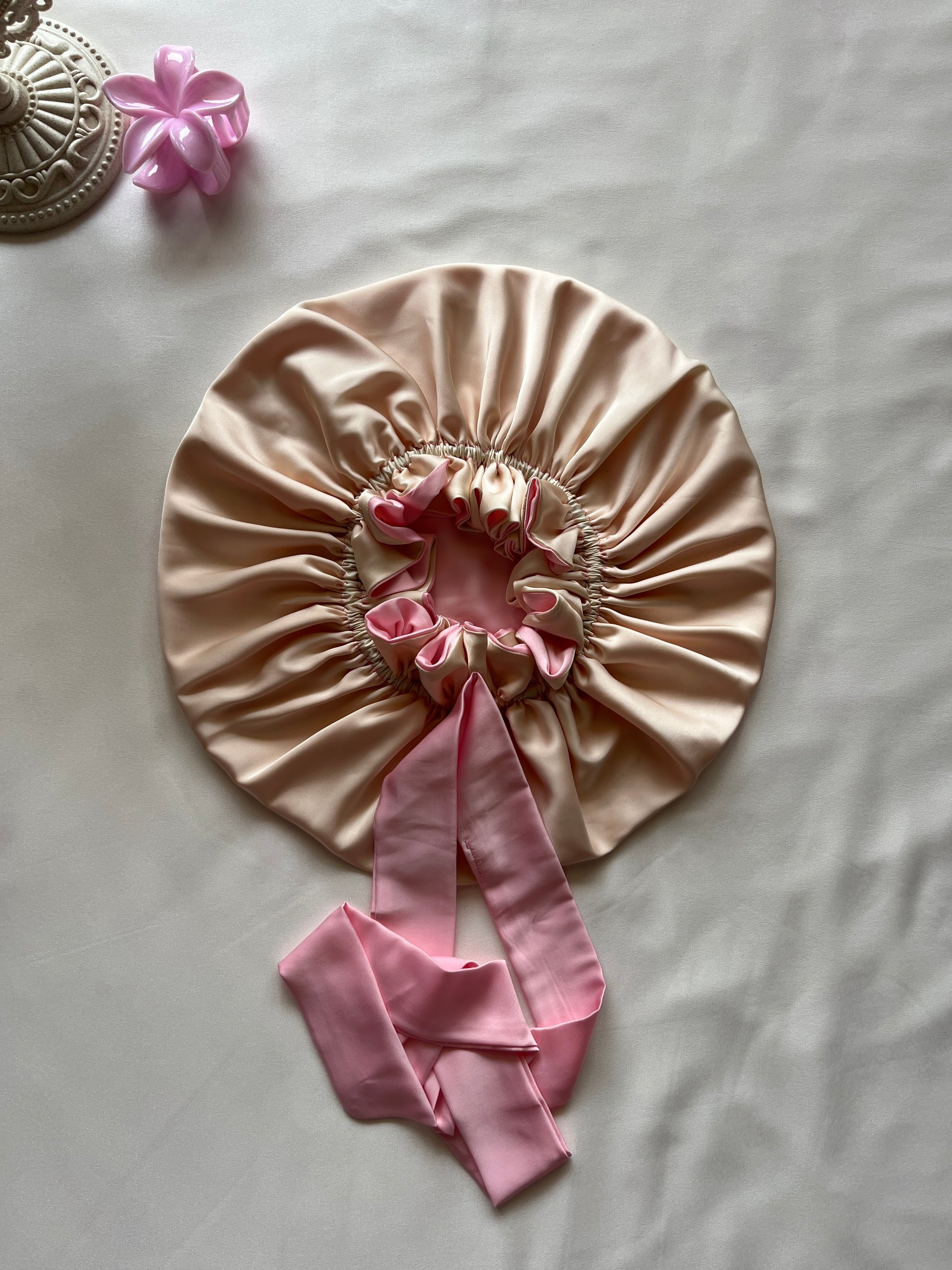 A soft hair bonnet, part of our Pillow Talk Silk Collection. Made from a cream silk blend (not 100% silk) with a baby pink interior and bow for that dreamy finish.
