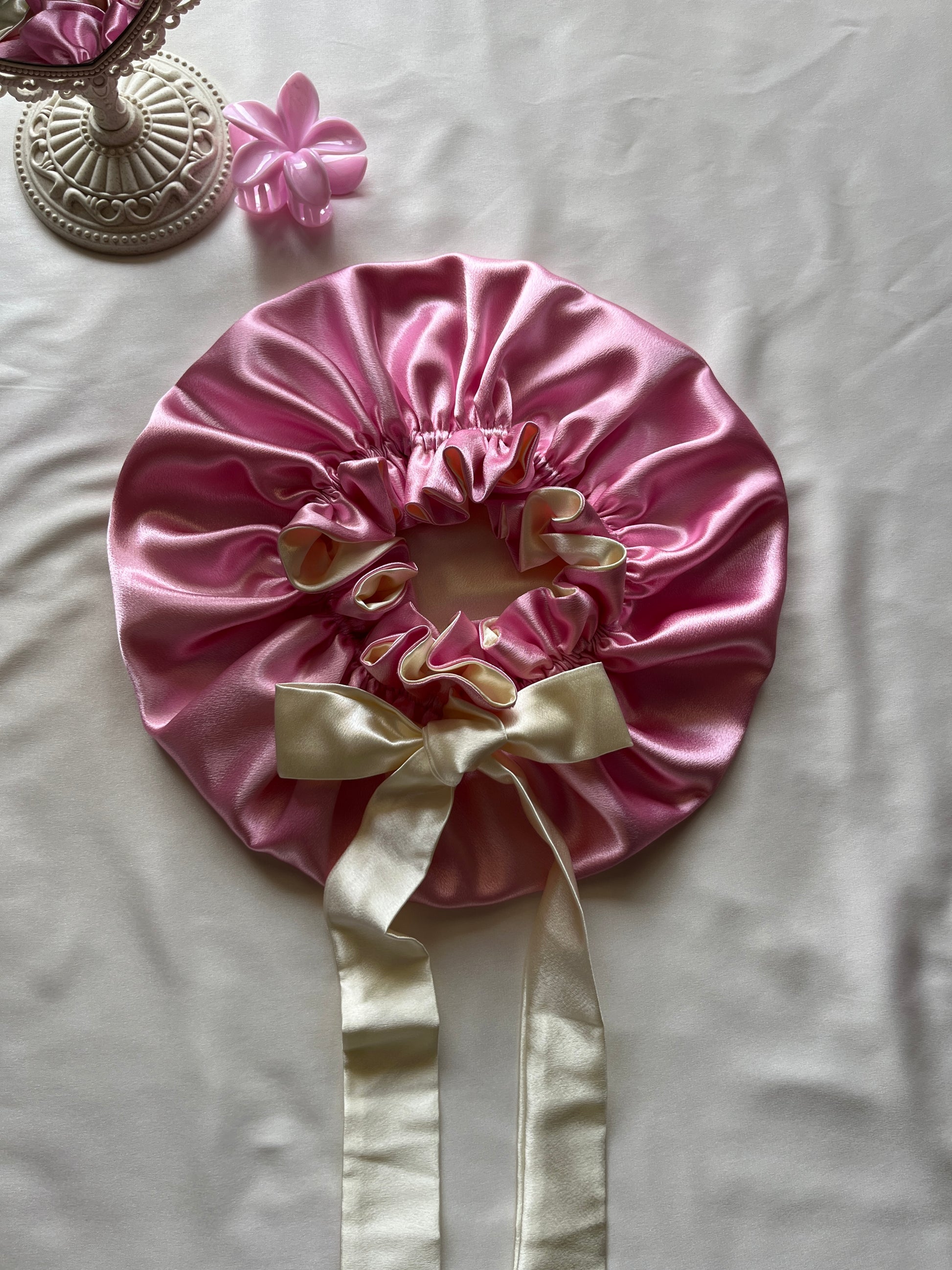 A dreamy pink bonnet with cream interior and a pretty bow, made for self-care Sundays, fluffy pillows, and the girl who always adds a touch of poetry to everything.