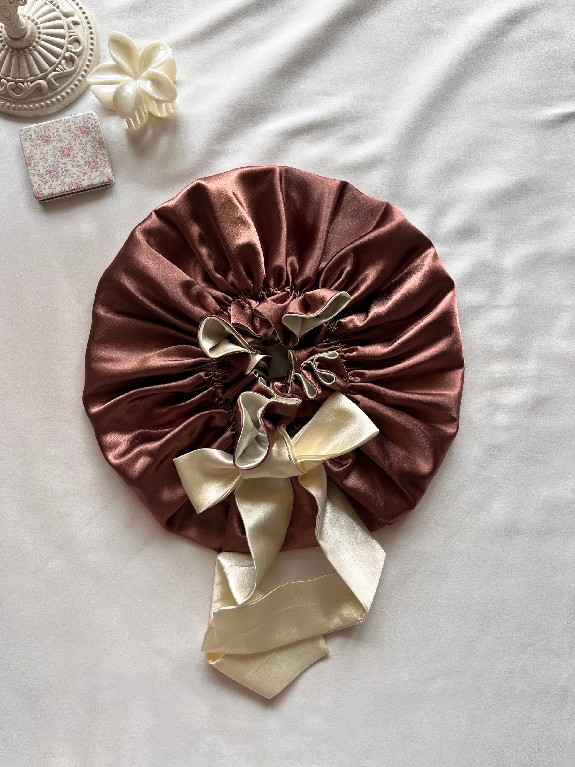 Toffee Kisses satin bonnet is pure softness, pure sweetness made to glow with you through morning routines and nighttime journaling.